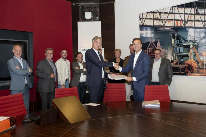 Wijnand van den Brink, Lid College van Bestuur Hogeschool Rotterdam en Albert van der Meulen, algemeen directeur Gom ondertekenen in het bijzijn van betrokkenen van beide organisaties het nieuwe contract.