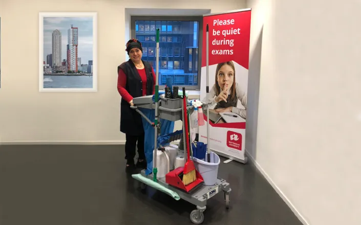 Gom is al langer actief om de werkomgeving op verschillende manieren te ‘vergroenen’, van milieuvriendelijke schoonmaakmiddelen tot duurzaam transport - begin 2019 neemt het bedrijf de eerste elektrische bestelwagen in Nederland in gebruik. Ook de vele duizenden materiaalwagens die de schoonmaakmedewerkers elke dag gebruiken op de werkvloer zijn al een paar jaar minder belastend voor het milieu. ‘We zijn begonnen met het opknappen van bestaande materiaalwagens. Dat lieten we doen bij sociale werkplaatsen door mensen met een afstand tot de arbeidsmarkt. Maar uiteindelijk werden die refurbished materiaalwagens te duur en liet de uitstraling te wensen over’, zegt Ad van Poppel, directeur KwaliteitsZorg en Innovatie bij Gom.