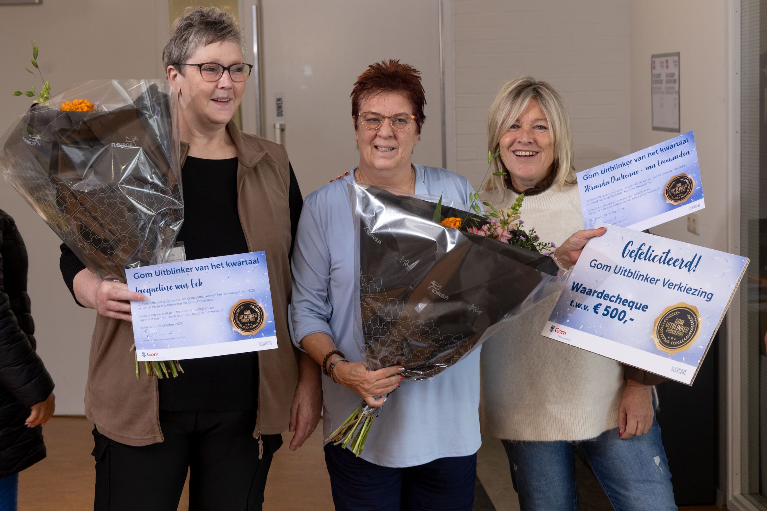 Els vervolgt: “Daarnaast blinken Jacqueline en Miranda uit in de aandacht die zij hebben voor hun collega's. Ze staan altijd voor hen klaar, bieden een luisterend oor waar nodig en bieden een helpende hand. Dankzij hun inzet, toewijding en oprechte aandacht maken Miranda en Jacqueline elke dag het verschil binnen Gom. Daarom verdienen zij allebei de titel ‘Uitblinker van het kwartaal!”