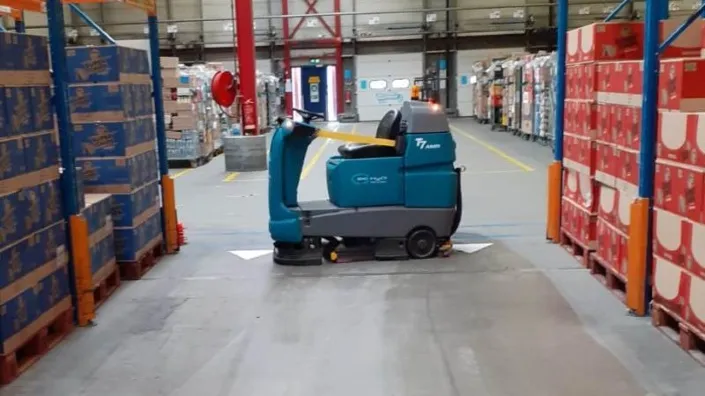 Behoedzaam zoeft de Tennant T7 AMR tussen de metershoge stellingen in het Albert Heijn DC op industrieterrein Loven in Tilburg door. Zonder bestuurder ziet het tafereel er een beetje ‘spooky’ uit. ‘Maar de route is in het geheugen geprogrammeerd en met de ingebouwde sensoren ontwijkt de machine elk obstakel’, verzekert Tim.