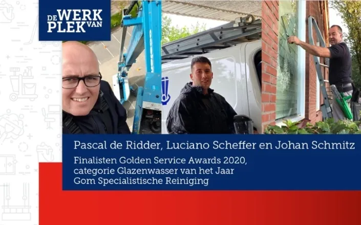 Maar liefst drie medewerkers van Gom Specialistische Reiniging staan op 3 december in de finale van de verkiezing van glazenwasser van het jaar: Johan Schmitz, Luciano Scheffer en Pascal de Ridder. Het is de eerste keer dat de verkiezing deel uitmaakt van de uitreiking van de Golden Service Awards in de branche. Vijf glazenwassers zijn genomineerd voor de ‘Oscar’ van het vak. Hoog tijd daarom om - met enige hoogtevrees - de ladder te beklimmen voor een interview met alle drie.