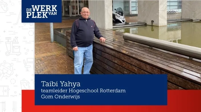 ‘Als ik boos word verpest ik mijn eigen dag’ 1 april is de dag dat een grapje moet kunnen. Maar dat op die dag teamleider Taibi Yahya vertrekt bij Hogeschool Rotterdam, is zéker geen grap. Niet dat de 66-jarige Taibi ernaar uitkijkt. Hij is als zeventien jaar het lachende gezicht van Gom en sinds 2011 van Gom Onderwijs, die elke dag vanaf half zeven ‘s morgens aan de slag gaat op de locatie Museumpark. Geen dag met tegenzin, zegt hij zelf. ‘Als je plezier hebt in je werk, kost het je ook geen moeite.’ Zo, die regel mag bij z’n afscheid wel op een tegeltje.