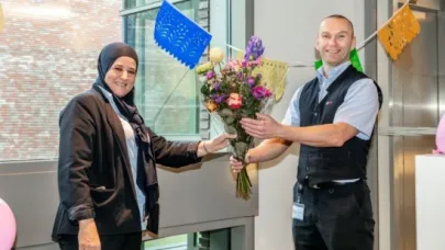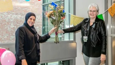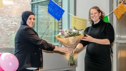 Yamina was ontroerd door de filmpjes en de lieve woorden van iedereen. Samen met haar leidinggevenden en Hettie Snijders en Carine Claus van het Meander Medisch Centrum hebben ze een heerlijk stukje taart gegeten. Ook zijn de prijzen en bossen bloemen overhandigd.