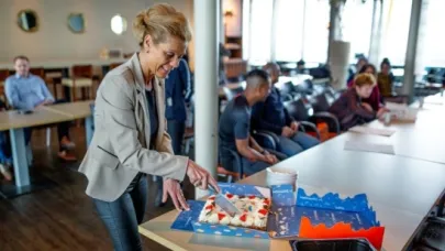 Annabel Amers van Gom mag zich officieel de 70.000ste schoonmaakmedewerker noemen die het BOS-diploma heeft behaald. Het was een feestje waard tijdens de uitreiking van de diploma’s aan Annabel en haar mede-cursisten van Gom, in het bedrijfsrestaurant van het Schiedamse hoofdkantoor. Met ruim 4.000 gediplomeerden is Gom een van de ‘grootafnemers’ van het diploma basisvakopleidingen. Het geeft aan hoeveel belang Gom hecht aan goede opleidingen. Niet toevallig hebben ook de aanstaande algemeen directeur Olivier Laméris en HR-directeur Marjolein Reijs het diploma behaald.