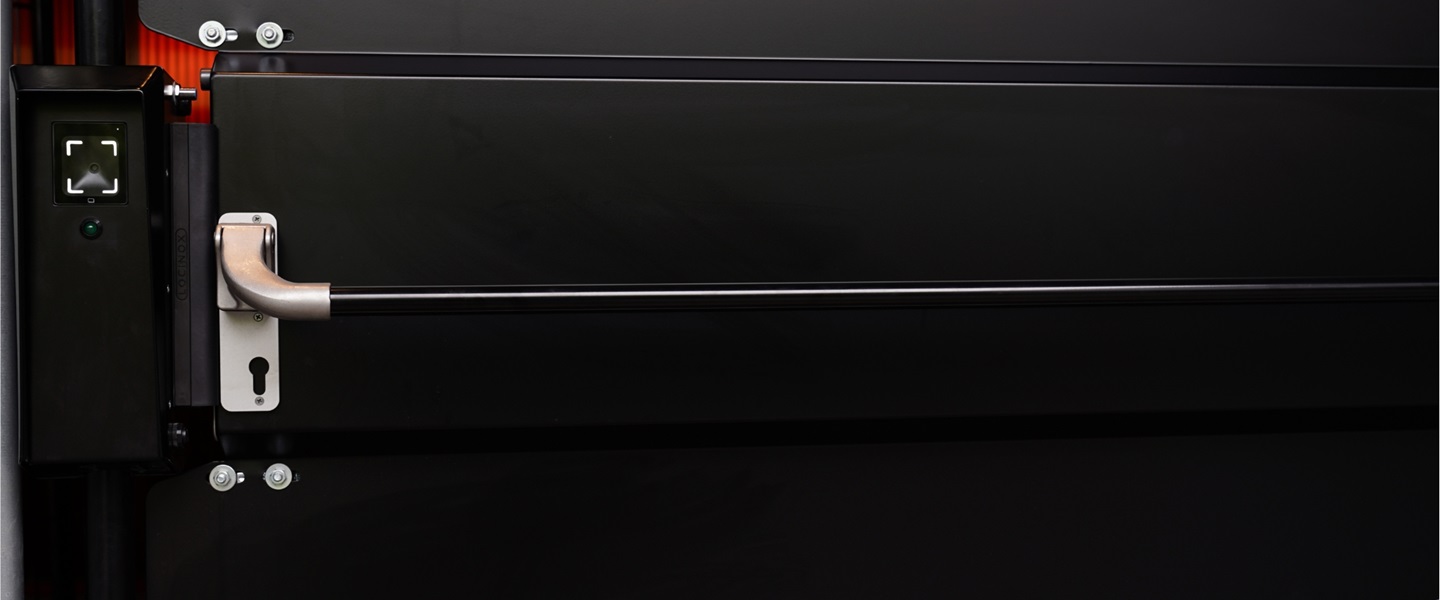 Een beveiligde nooduitgang speciaal ontwikkeld voor evenementen. Bezoekers kunnen veilig en conform alle richtlijnen vluchten, zonder dat er medewerkers bij de nooduitgang staan. Een panieksluiting (push bar) en slimme sensoren zorgen dat er veilig gevlucht kan worden en het blokkeren van een nooduitgang altijd wordt gedetecteerd. Tegelijk is de nooduitgang beveiligd tegen ongeautoriseerde toegang en misbruik.